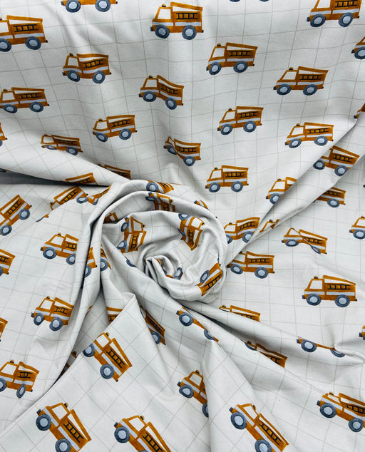 Vollständige Details anzeigen0,5 m Baumwoll-Jersey „Feuerwehrauto“ Senfgelb