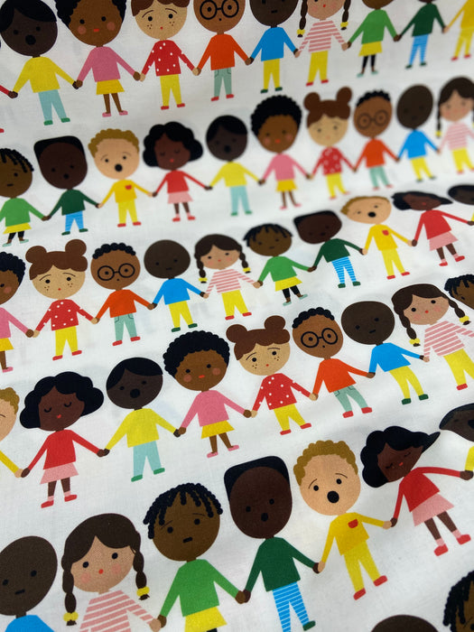 Dieser schöne Stoff, zeigt Kinder aller Hautfarben Händchen haltend auf einer Länge von 110 cm in einer Reihe.